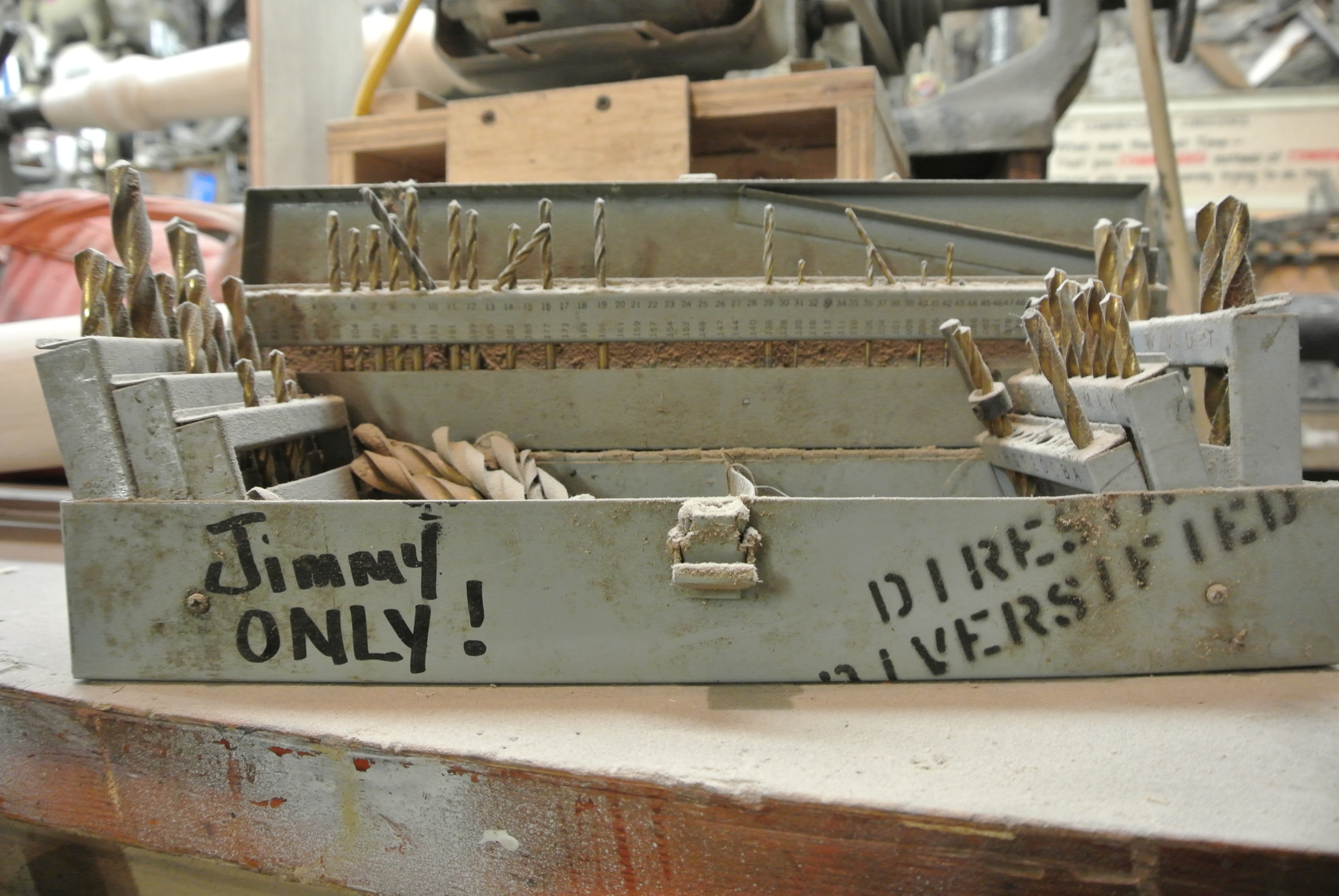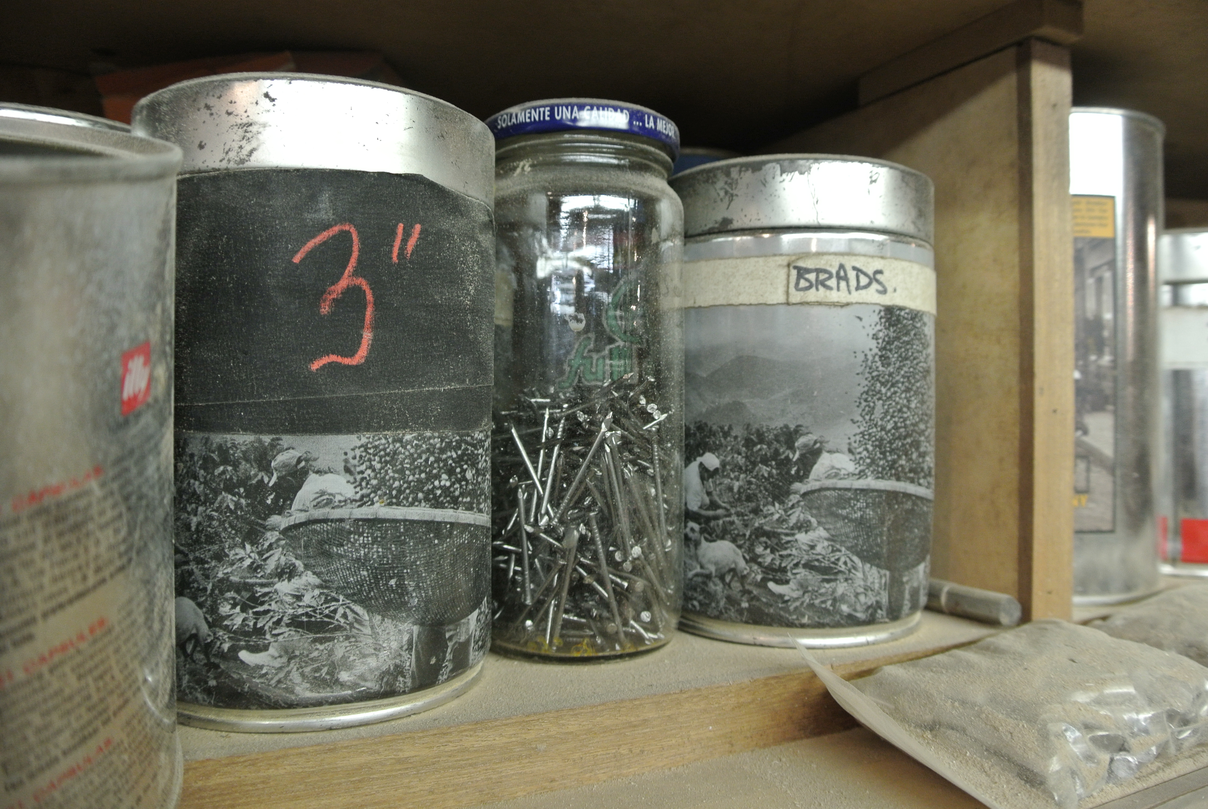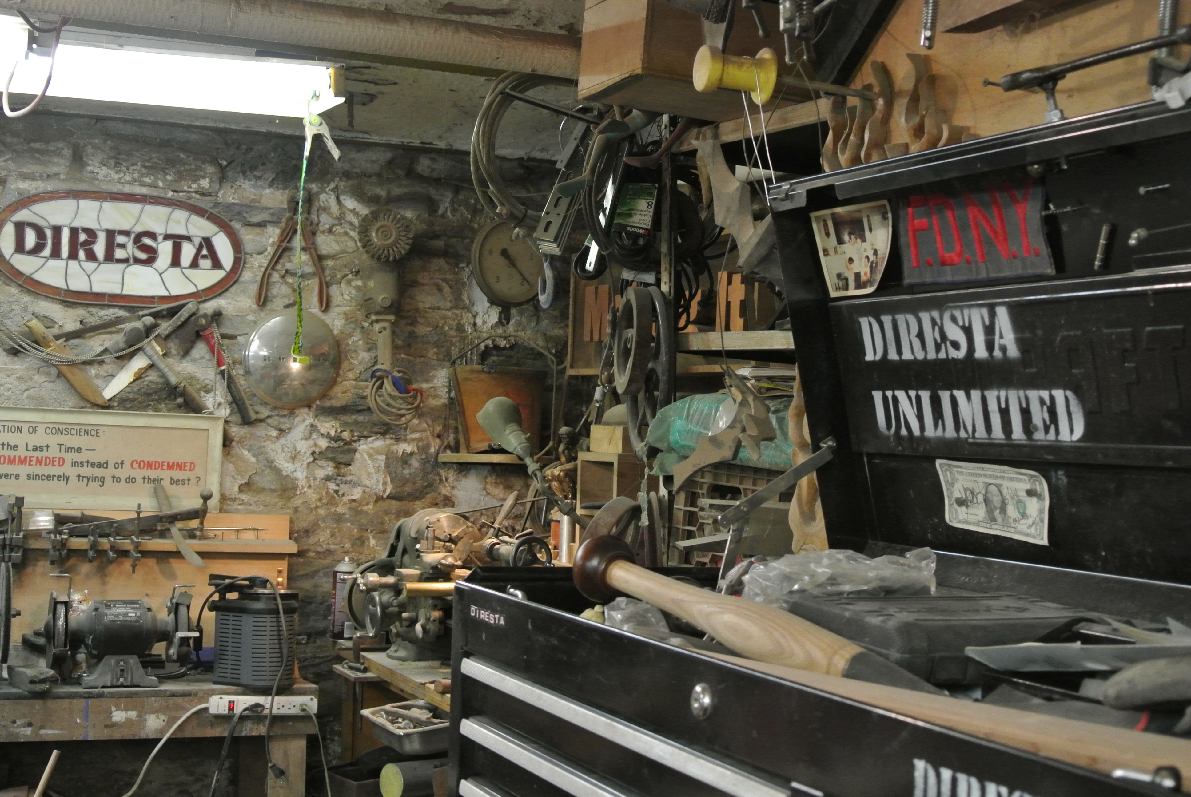 If you watch those videos carefully, you’ll see DiResta’s shop from the inside. He has maintained this current shop for a decade, and before that had two others in New York City and Long Island. Friends and proteges drop in regularly, and his girlfriend, Taylor Forrest, makes some leather furniture there. The ceilings are low, and ornamented with tools and old projects. DiResta admits to being a bit of a hoarder, pulling a chisel, which he’ll use for an upcoming project, from a drawer full of dozens of them. Another drawer is full of nothing but medical clamps. The DiResta logo is spray painted or etched into scattered old projects, like guitars and old saws. The entry descends from street level into a large room with a ShopBot and stacks of wood DiResta picked up from a colleague who moved out of another shop. His cat, Spike, has free rein.