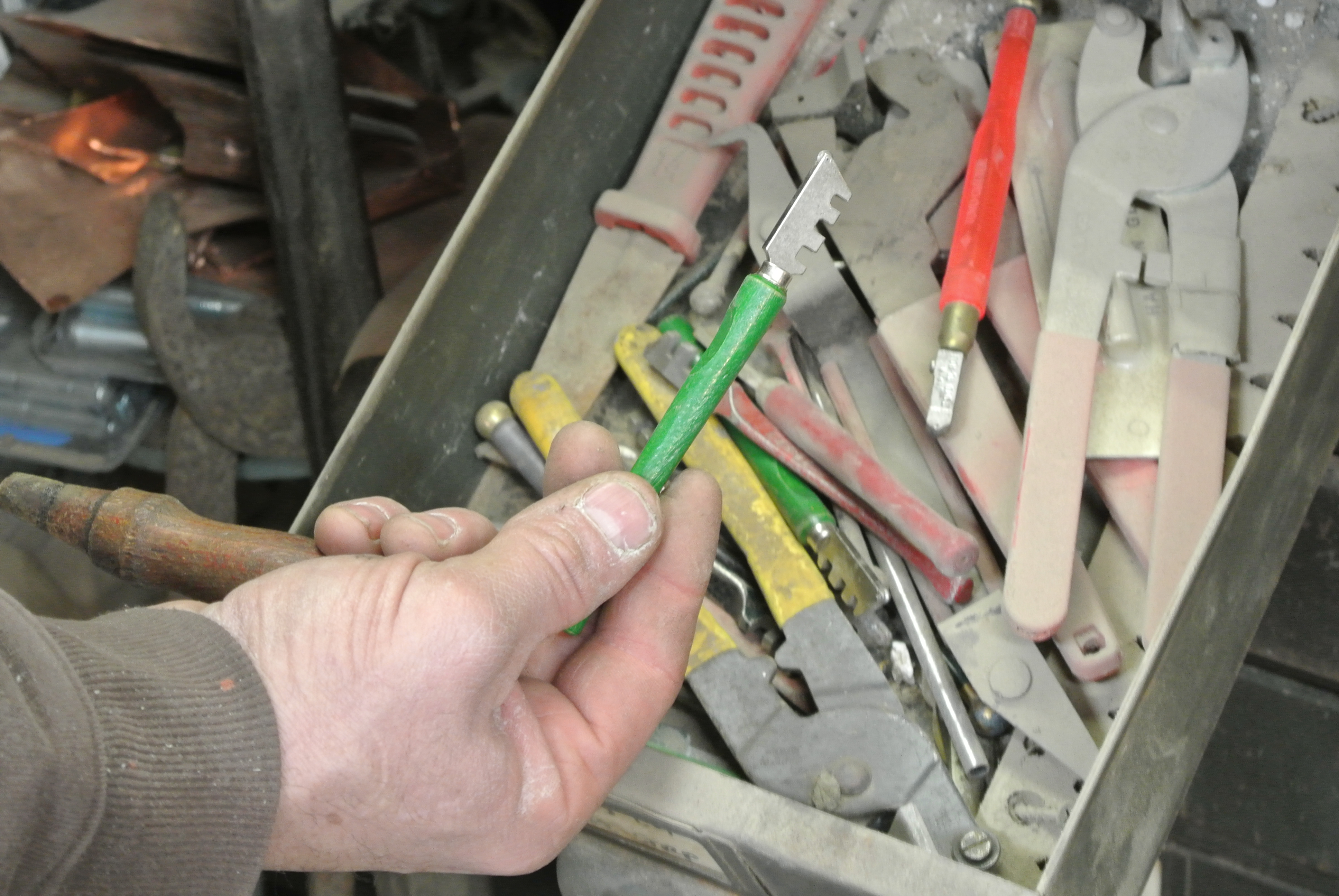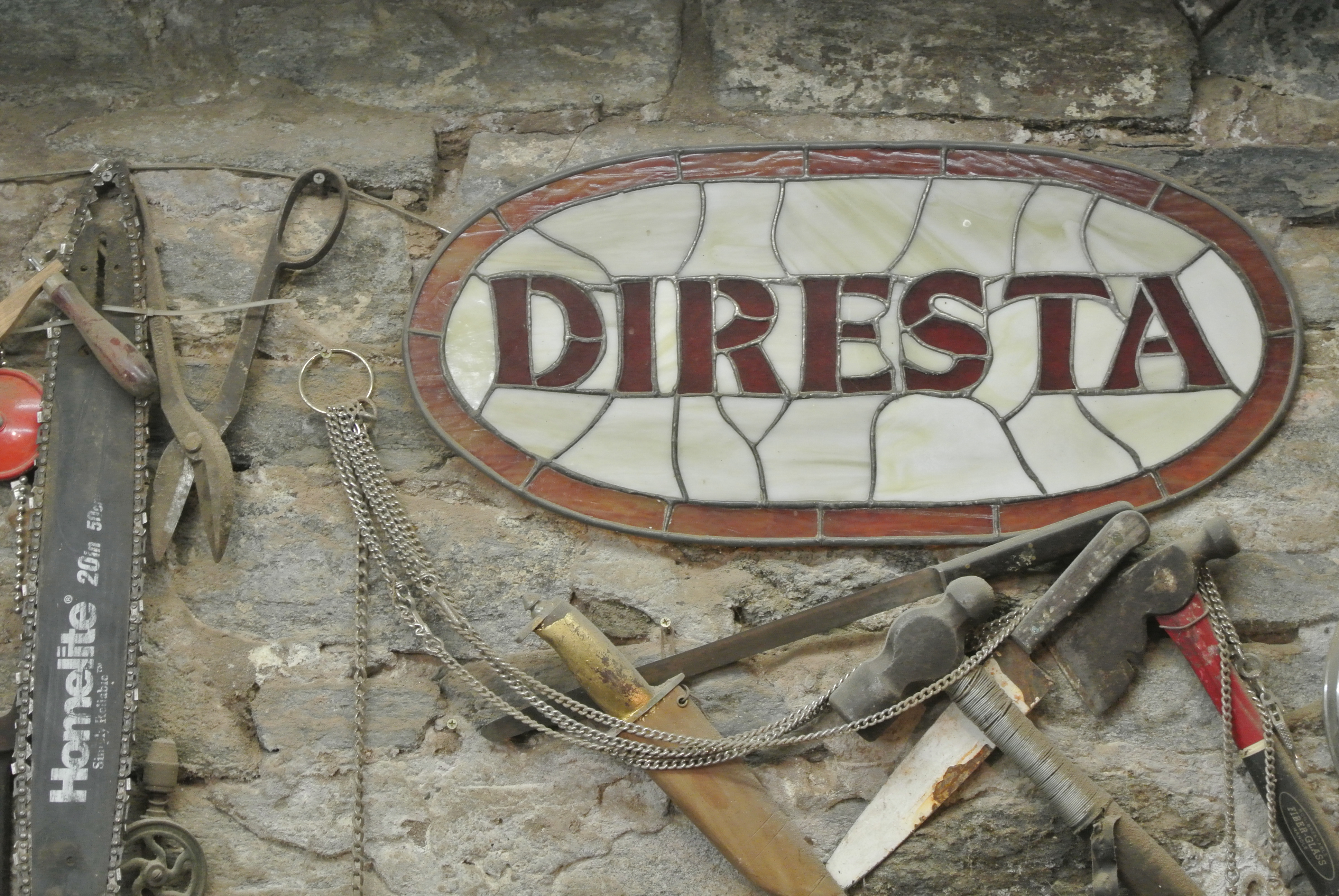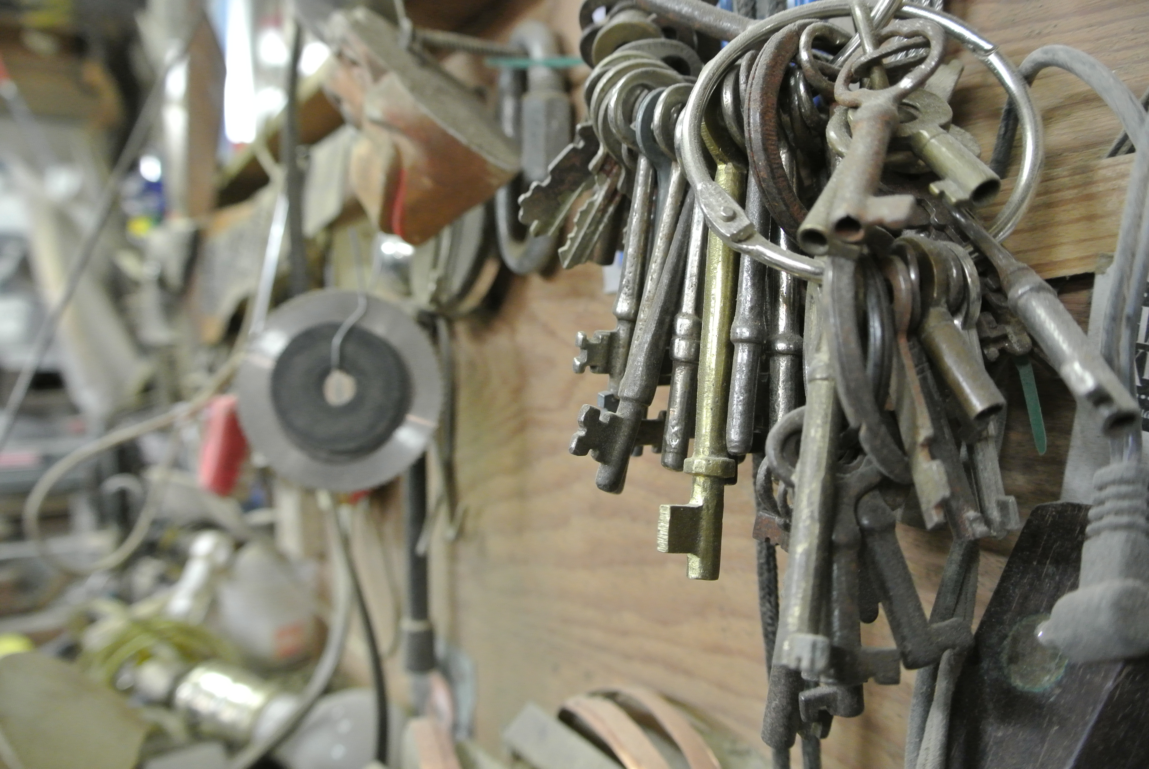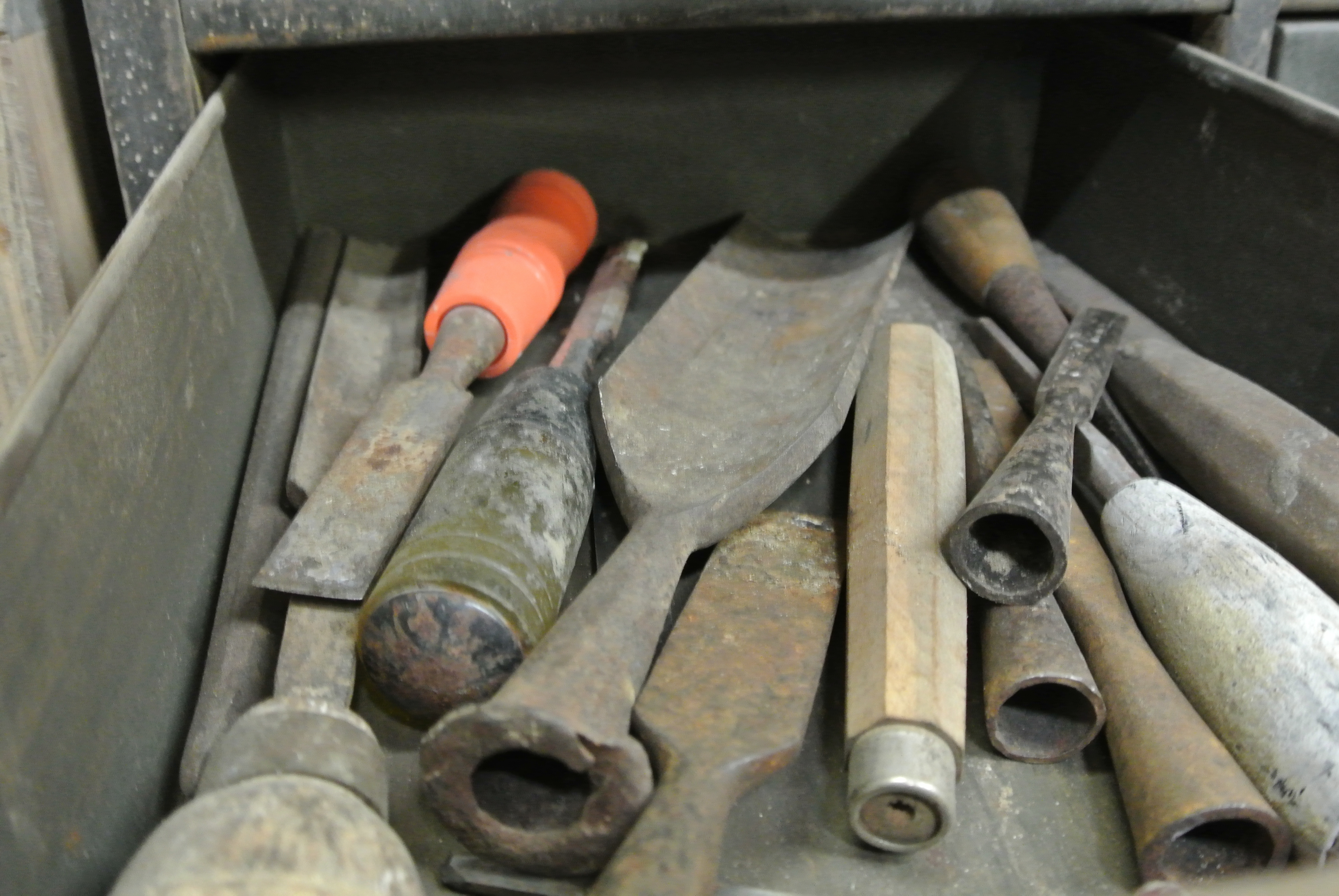 If you watch those videos carefully, you’ll see DiResta’s shop from the inside. He has maintained this current shop for a decade, and before that had two others in New York City and Long Island. Friends and proteges drop in regularly, and his girlfriend, Taylor Forrest, makes some leather furniture there. The ceilings are low, and ornamented with tools and old projects. DiResta admits to being a bit of a hoarder, pulling a chisel, which he’ll use for an upcoming project, from a drawer full of dozens of them. Another drawer is full of nothing but medical clamps. The DiResta logo is spray painted or etched into scattered old projects, like guitars and old saws. The entry descends from street level into a large room with a ShopBot and stacks of wood DiResta picked up from a colleague who moved out of another shop. His cat, Spike, has free rein.
