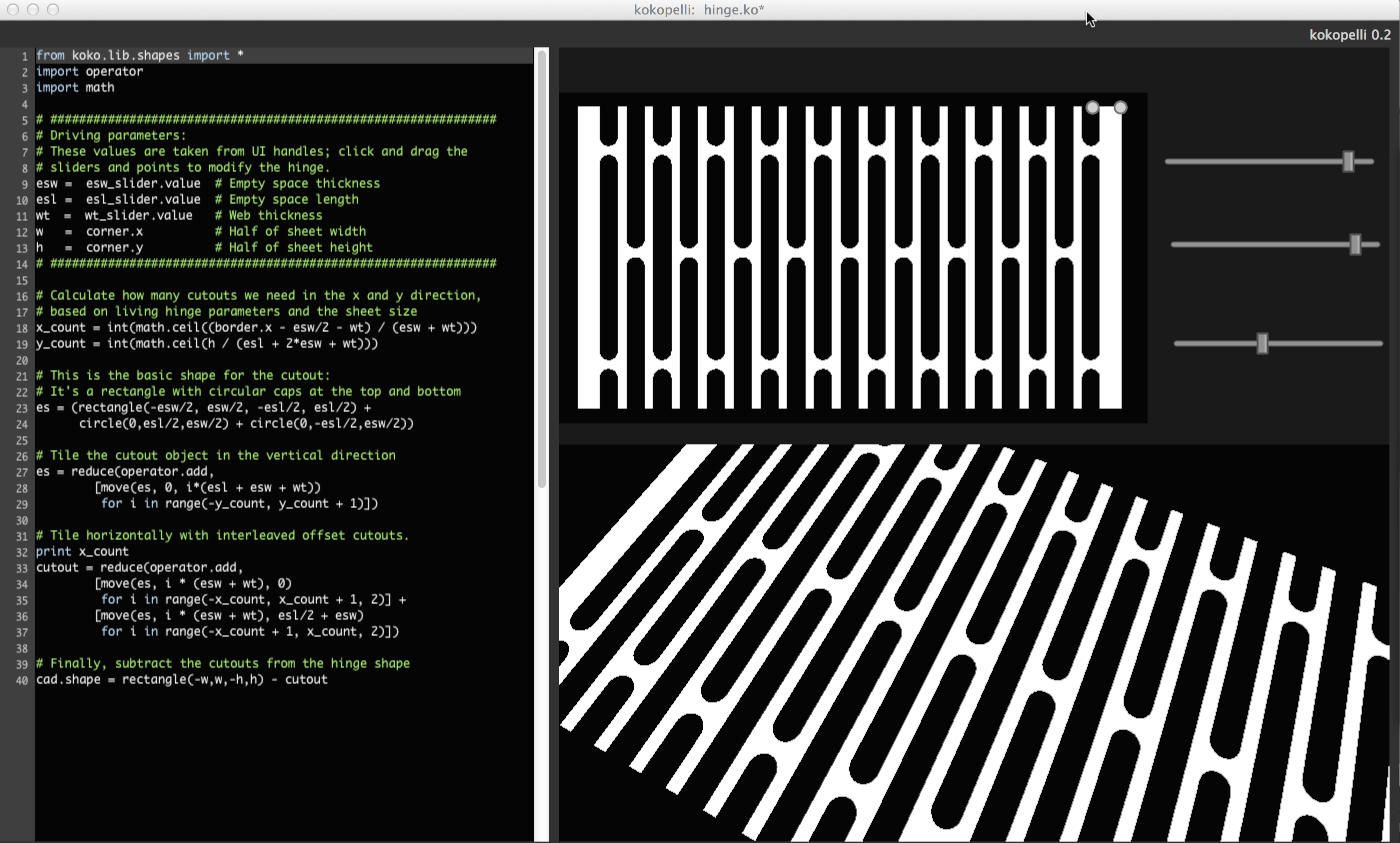 Keeter has included a kokopelli living hinge example has built-in sliders that make it simple to create your own bespoke flexibles from rigid materials using digital fabrication tools. The parametric living hinge code was originally created by 2014 Fab Academy student Terence J. Fagan and then improved by Matt Keeter. If you’d like to learn more about how he created the code from scratch, check out his tutorial.