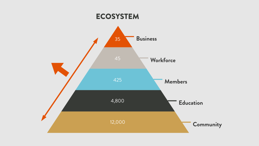 Nathan describes focusing on connecting an ecosystem that Nathan describes as pyramid; it has five segments. The ecosystem involves reaching out to the community, meeting the educational needs of students, serving its 425 members, providing workforce development opportunities and offering a launchpad for entrepreneurs. He makes the point that if you want to grow any of the constituencies, you have to grow the ecosystem, not just that constituency.