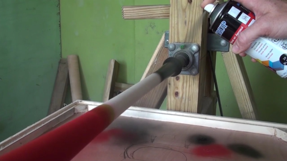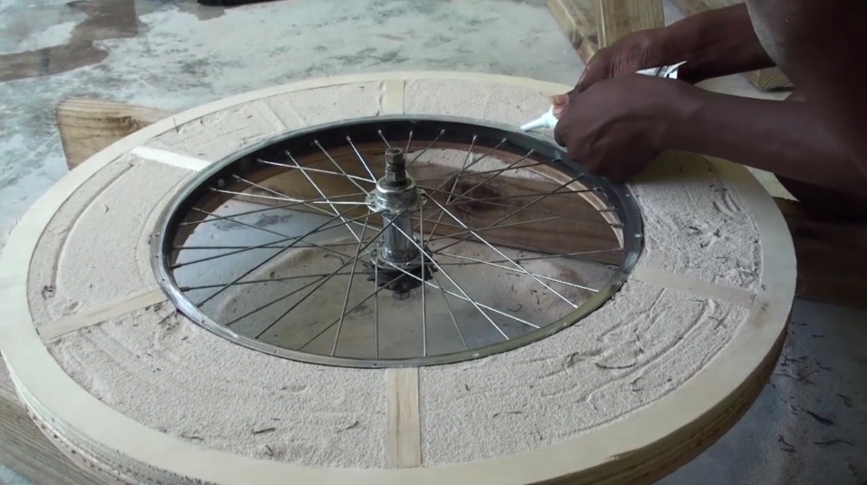 Lewis didn’t travel with the entire lathe. He only brought the plans, tools, hardware, and some critical parts like the bicycle wheel-based flywheel and chain drive system. Once in Punta Cana, he sourced locally-available wood and filled the flywheel frame with sand to weight it down properly.