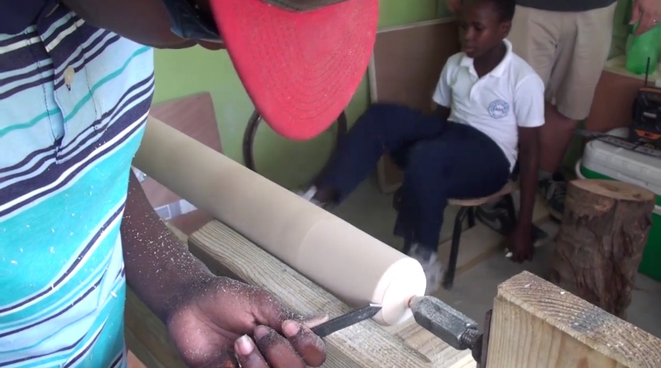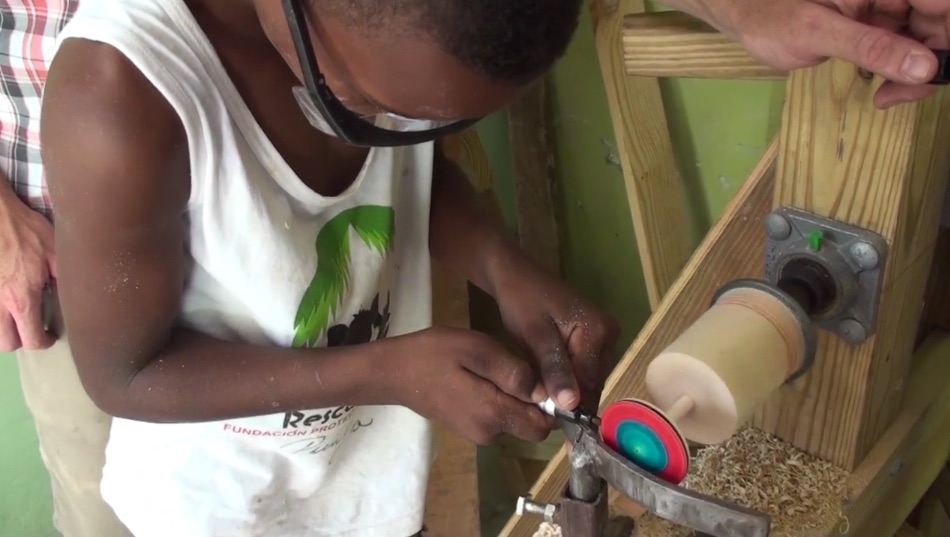 Turners without Borders is an organization of woodturners created by the American Association of Woodturners. They have a number of initiatives designed to bring the good news of woodturning to farflung corners of the world. One of their newer members, Canadian shop teacher Scott Lewis, traveled to the Dominican Republic last year, to the town of Punta Cana, to build a lathe and teach turning at an education center there. TWB sponsored the trip and loaned him their tools.