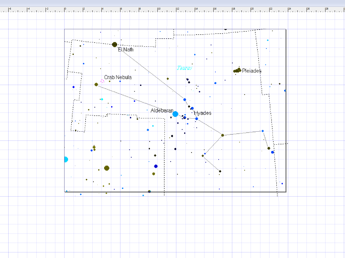 Pick your constellation star map! Taurus is shown here. I pasted it into Inkscape. I made the image the size of the board so I could plan where to drill the star holes.