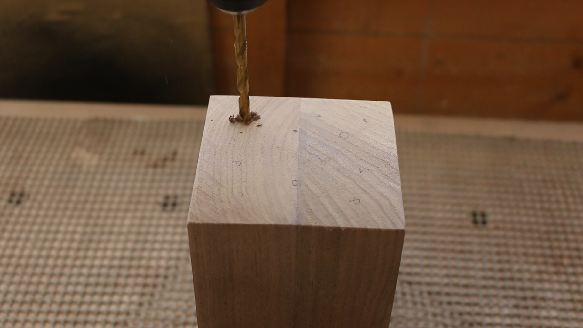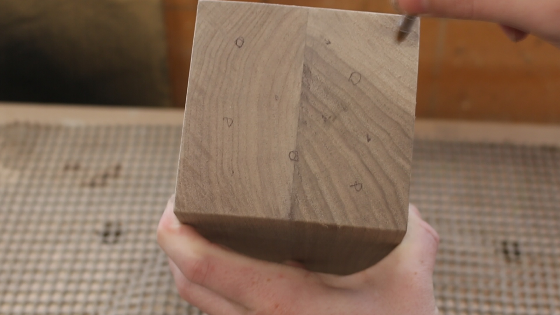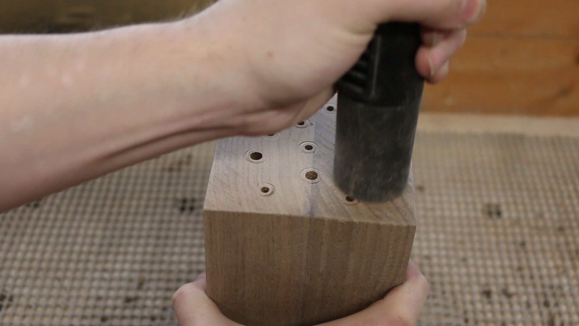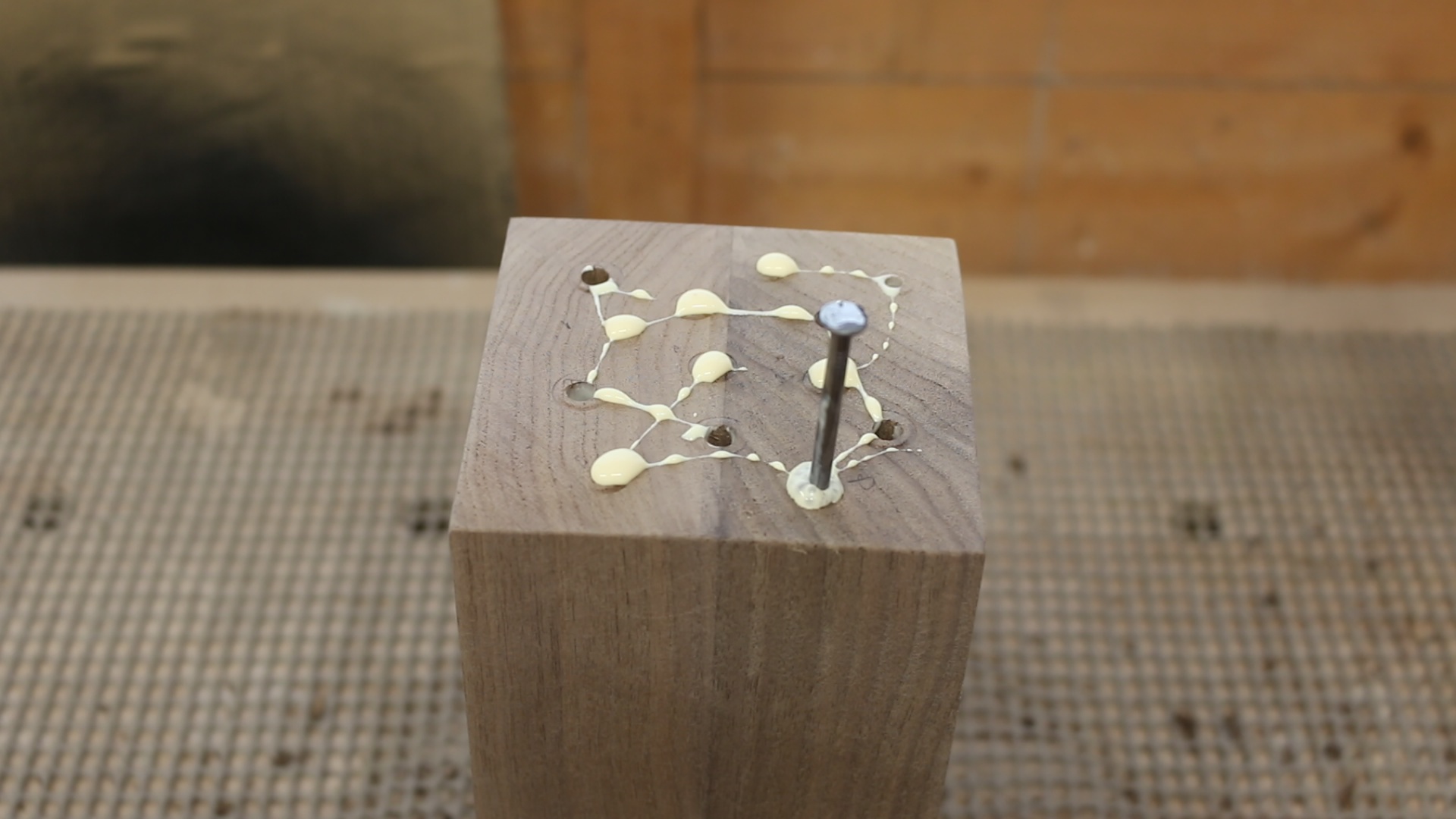 I wanted to use some nicer wood than the scrap so Glued up some 2″ thick walnut to create a 4″x4″ square. I would have sooner used 1 solid piece but only had 2″ stock on hand. I didn’t want to split the hardwood so I drilled a series of random holes to accept 2 different sized nails. I’m pretty sure the nails would be secure in place on their own but I added some wood glue to the holes just to be sure. I hammered the nails into the holes and let the glue set up for a couple of hours, again a bit over kill but I watched some youtube videos while I waited.