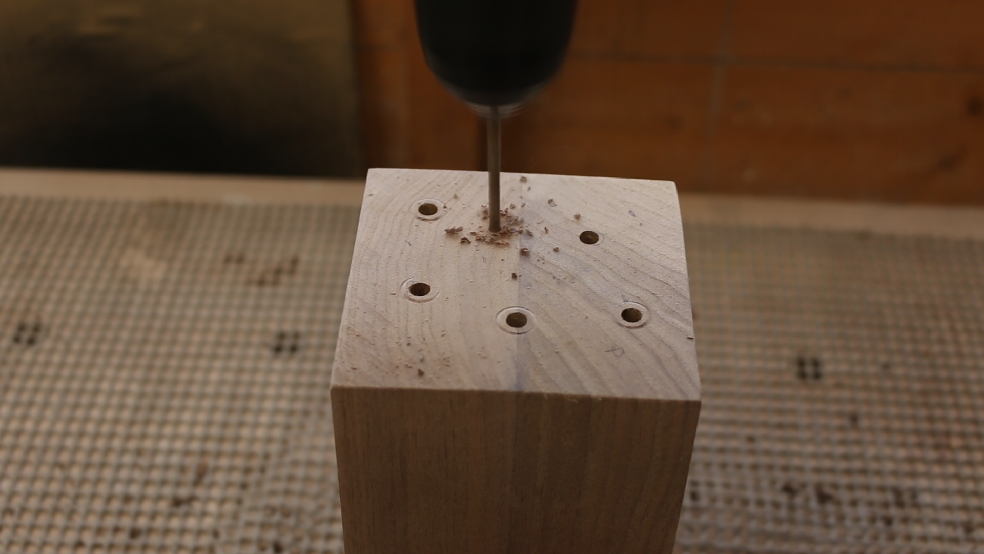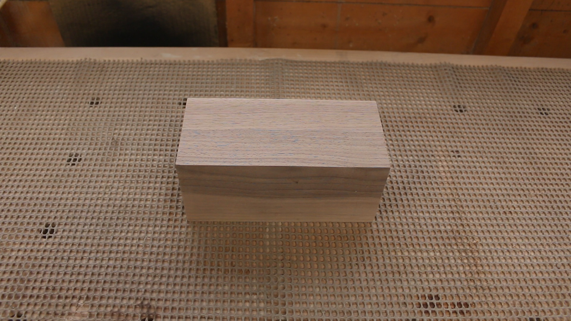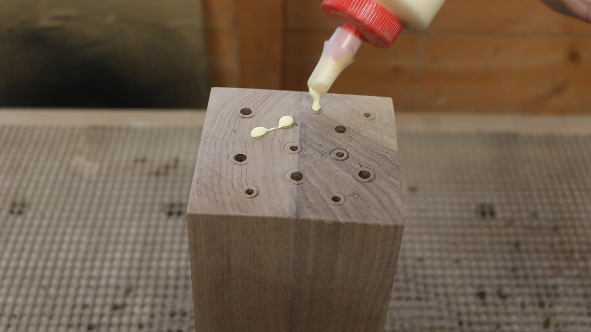 I wanted to use some nicer wood than the scrap so Glued up some 2″ thick walnut to create a 4″x4″ square. I would have sooner used 1 solid piece but only had 2″ stock on hand. I didn’t want to split the hardwood so I drilled a series of random holes to accept 2 different sized nails. I’m pretty sure the nails would be secure in place on their own but I added some wood glue to the holes just to be sure. I hammered the nails into the holes and let the glue set up for a couple of hours, again a bit over kill but I watched some youtube videos while I waited.