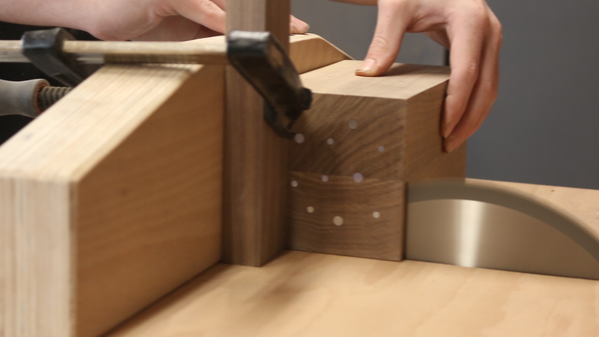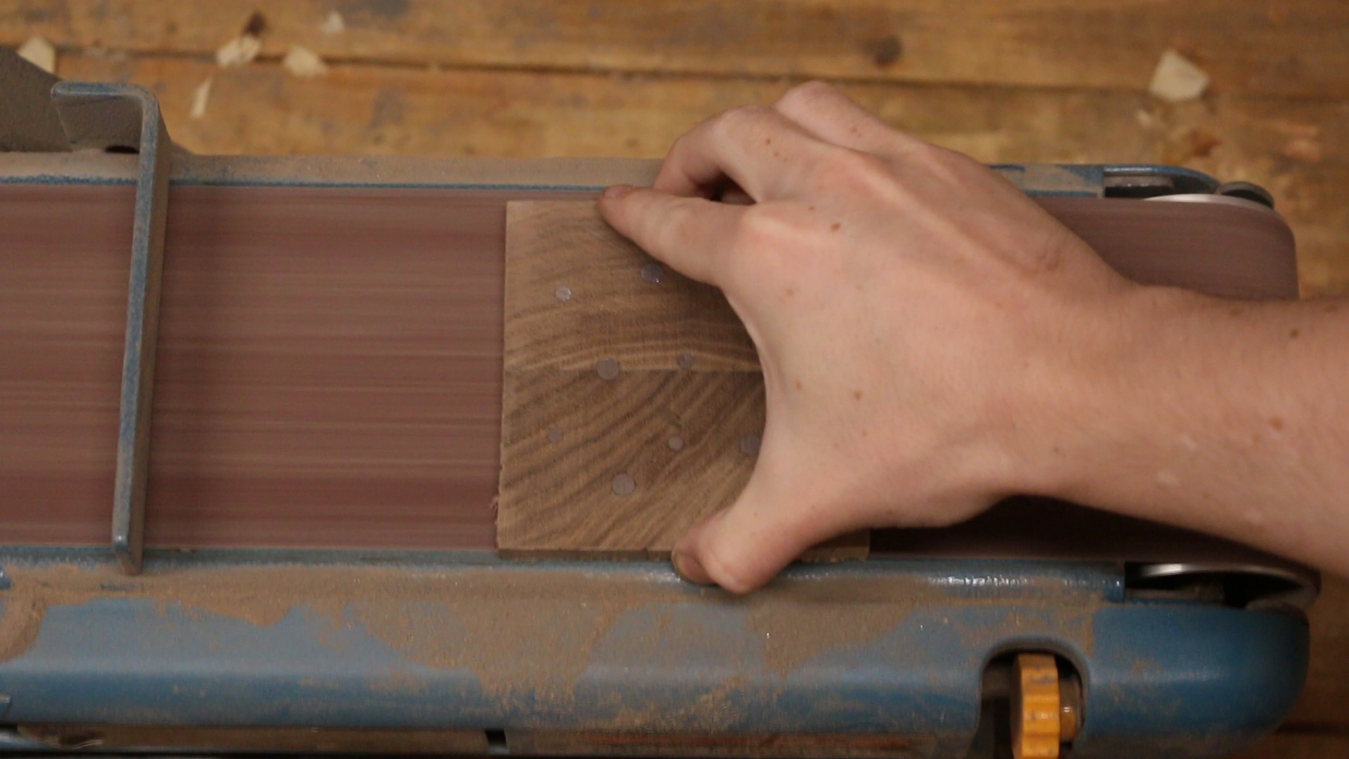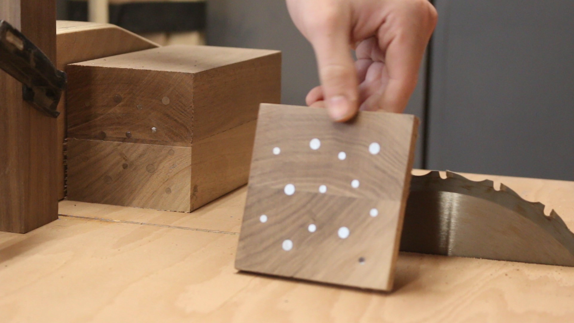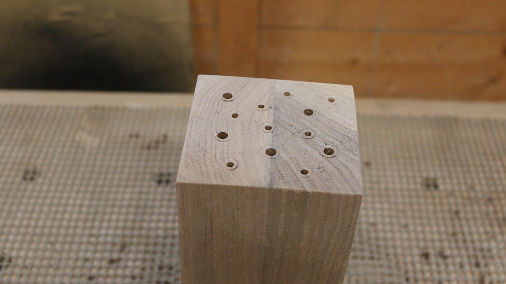 I wanted to use some nicer wood than the scrap so Glued up some 2″ thick walnut to create a 4″x4″ square. I would have sooner used 1 solid piece but only had 2″ stock on hand. I didn’t want to split the hardwood so I drilled a series of random holes to accept 2 different sized nails. I’m pretty sure the nails would be secure in place on their own but I added some wood glue to the holes just to be sure. I hammered the nails into the holes and let the glue set up for a couple of hours, again a bit over kill but I watched some youtube videos while I waited.