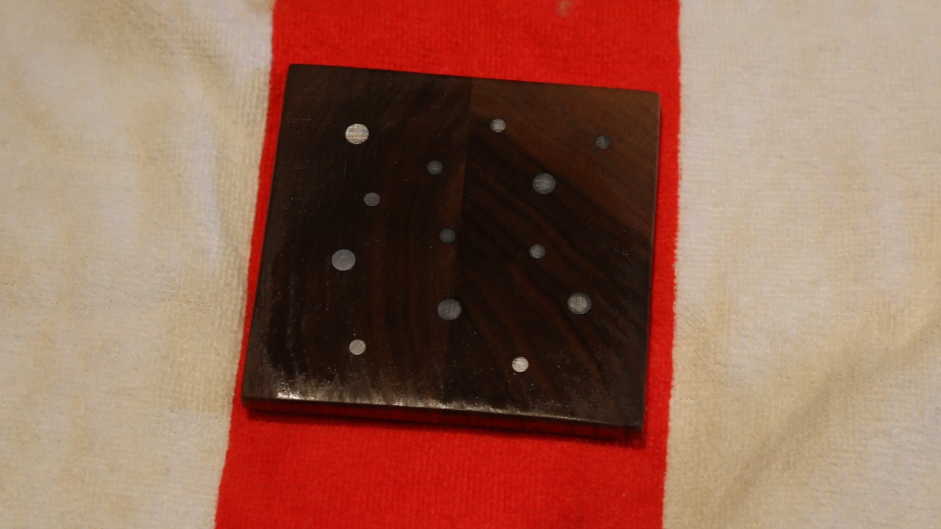 Now that that the blank was ready I just needed cut them into coaster size slices. I decided to use an Evolution table saw and a sled to cut them. Not all saws can cut through nails like these saws so you may want to try some other methods. perhaps use some coloured epoxy resin in place of the nails, you could even add some metallic powder to the resin to give the look of nails too. I first trimmed off the nails flush to the surface, then set up a stop block and proceeded to cut slices off the blank for coasters. I managed to cut 3 before I reached the depth that my drill bit didn’t. I wish it was longer but don’t we all. I will just need to re drill the holes and add more nails to use up the whole block at a later date.