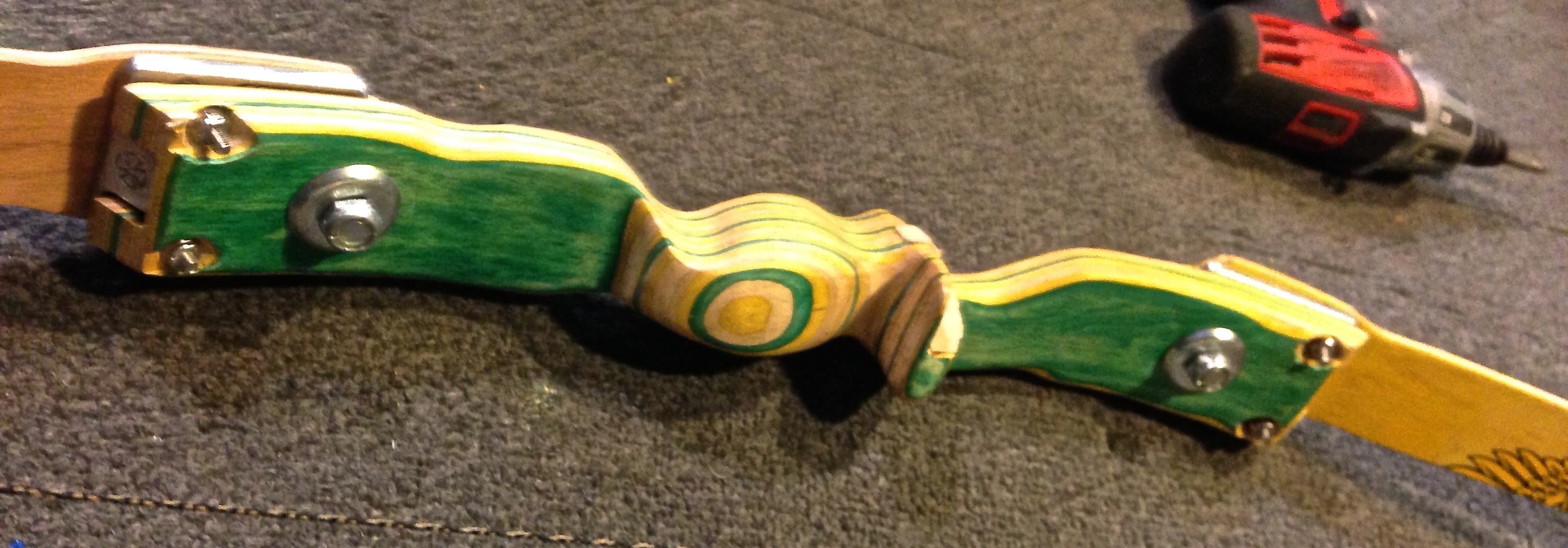 After struggling through some early prototypes, Mike heard of a contest in Rochester Michigan called Deck Art 2014. He really wanted to get his Skatebow involved, so he went through two sweat filled days and a new riser design to produce the bow that you see in the picture above. The blue limb came from one board, the green limb and riser from another. He says it should “shoot like a dream” when he gets a chance to add some strength to it.