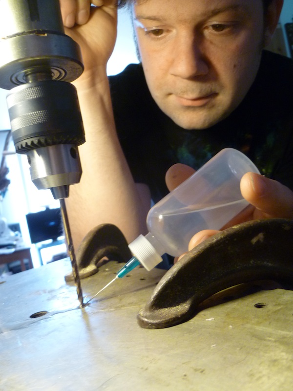 When using a high-powered hand drill such as this Milwaukee Magnum, be careful when drilling into dense or hard material, as the torque of the drill can actually rip it out of your hands. Use a right angle attachment if you have one, and grip the drill firmly, but not too tight. If the bit gets caught up as you’re going, be prepared to let go — it’s the safest thing to do sometimes. I’ve sprained my wrist in such situations, and have known others to even break their wrists.