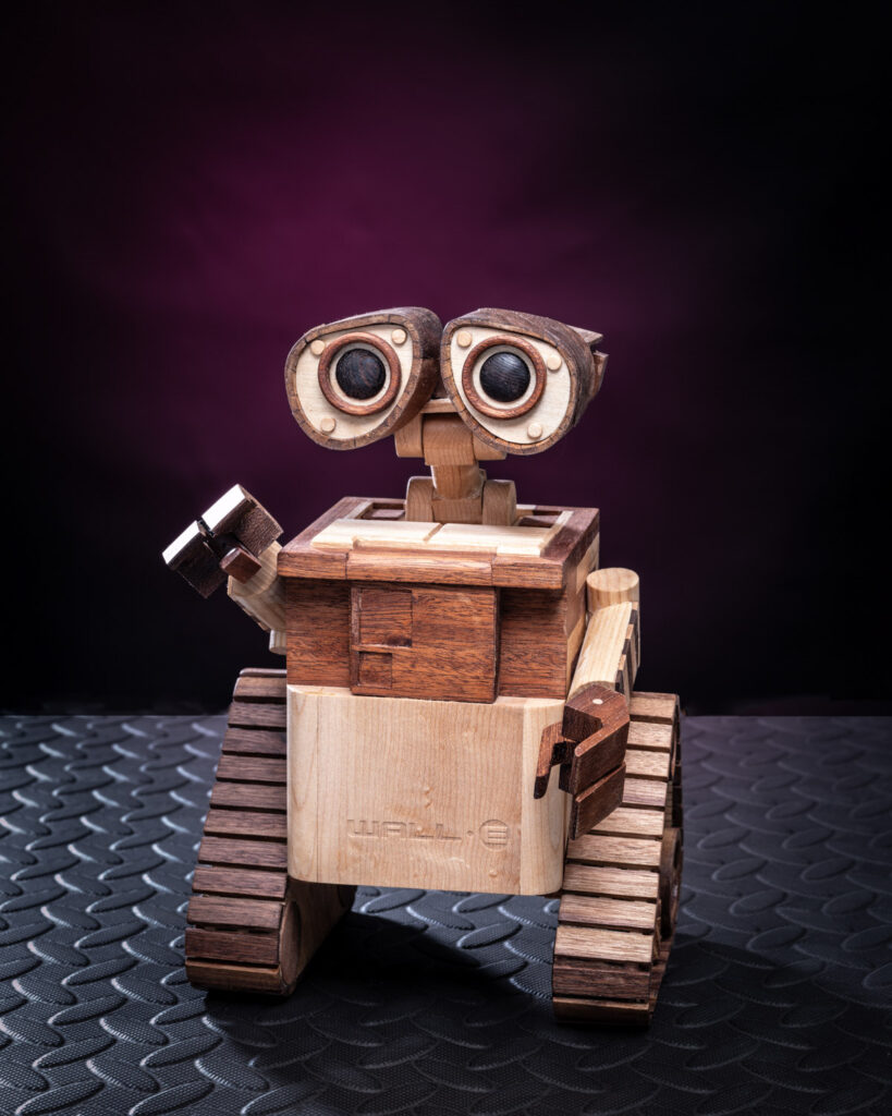 Vivian saved the tracks until the end, expecting them to be the most difficult aspect of the project, but they ended up coming together fairly easily. The rollers were turned on the lathe, with tracks formed from strips of black walnut glued to flexible ply and wrapped around the rollers. A colleague laser-engraved the front panel with the Wall-E font, and all that was left were a few coats of Danish oil to literally finish the project.
