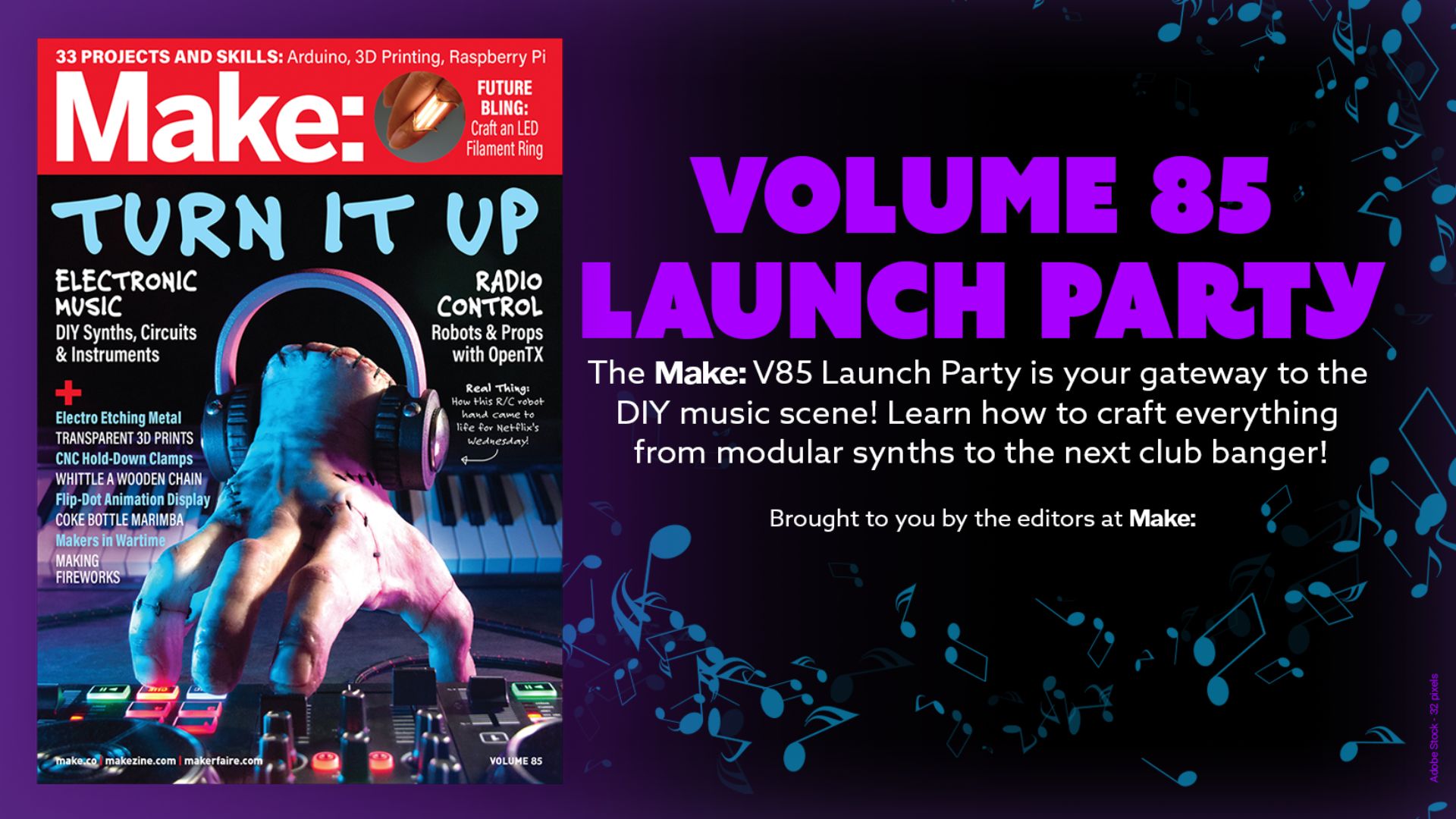Make: Volume 85 is your gateway to the burgeoning DIY music scene! From soldering together your first synth, to modular SDIY, to simple software solutions, join our editorial staff and a modicum of maker musicians to learn how to craft everything from speakers and squeakers to the next club banger. We'll also be talking R/C toys and props, including a look at a working "Thing" prop from Netflix's Wednesday. Register now for a chance to hear insights and inspiration from our illustrious contributors, as well as to join us for the virtual after-party!