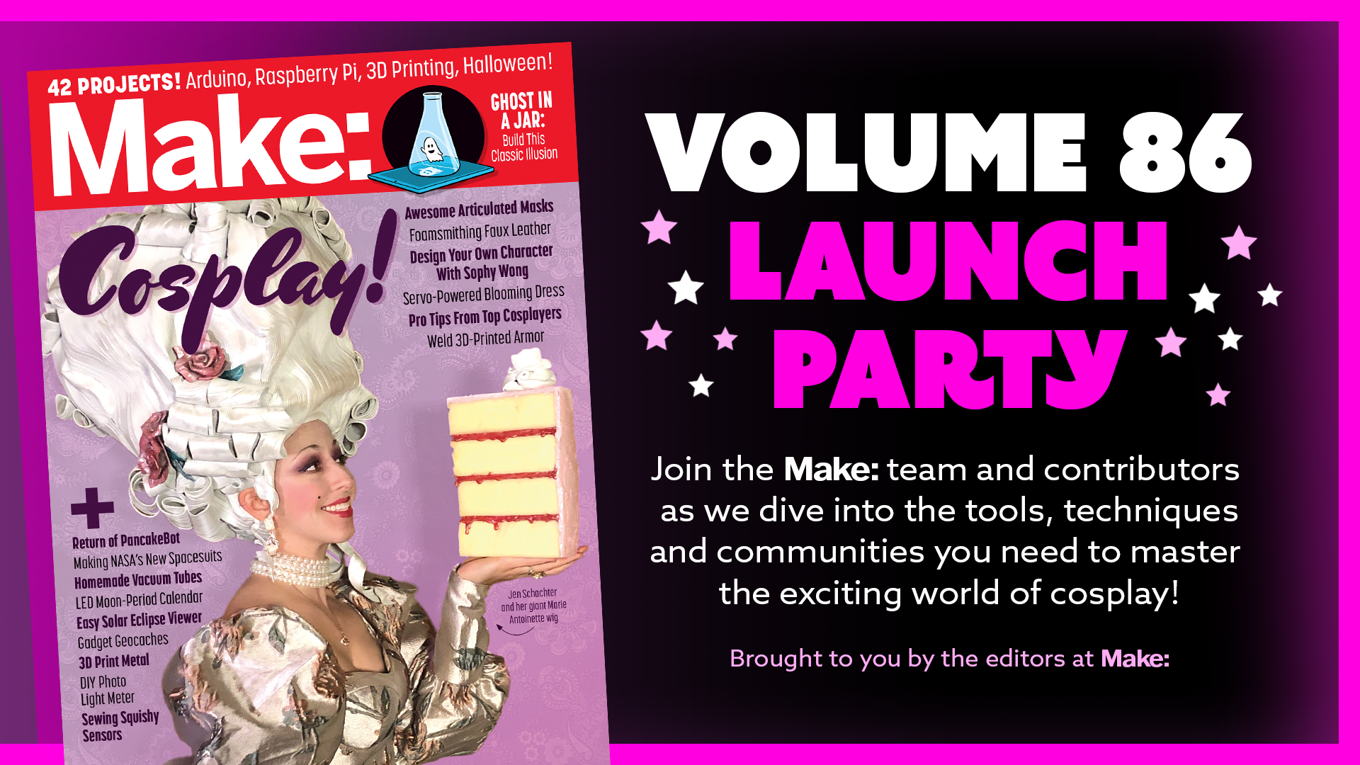 Make: Volume 86 is your crib sheet for mastering the exciting world of cosplay! From using EVA foam to make realistic-looking leather costumes, to big armor build techniques that allow you to go way beyond your 3d printer's native capabilities, to successfully designing your own original character from scratch, we show you how to master the skills you need to create amazing costumes. We've also got expert cosplayers sharing their favourite techniques, tools, and communities to help get you started and build your skills. Register now for a chance to hear insights and inspiration from our illustrious contributors, as well as to join us for the virtual after-party!