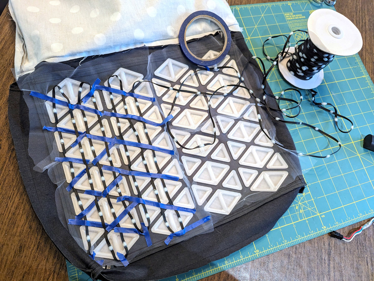 Since 2017, novel creative techniques, like 3D printing on fabric, and newly available products, such as uber-flexible LED strings, have continued to expand the potential of wearable tech. My new Tessellated Tote integrates a broad array of maker skills including 3D printing, sewing, and electronics to produce a modern carryall. The bag’s front panel is illuminated by lightweight addressable string lights secured behind translucent tiles which are 3D printed onto a layer of tulle fabric. The tulle holds the individual tiles in a space-filling geometric arrangement that moves and flexes with the fabric around it.