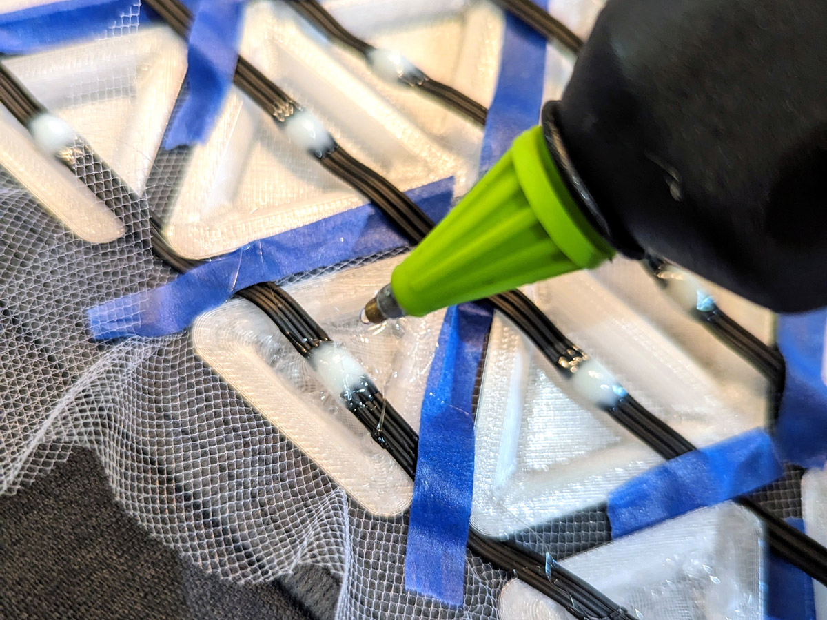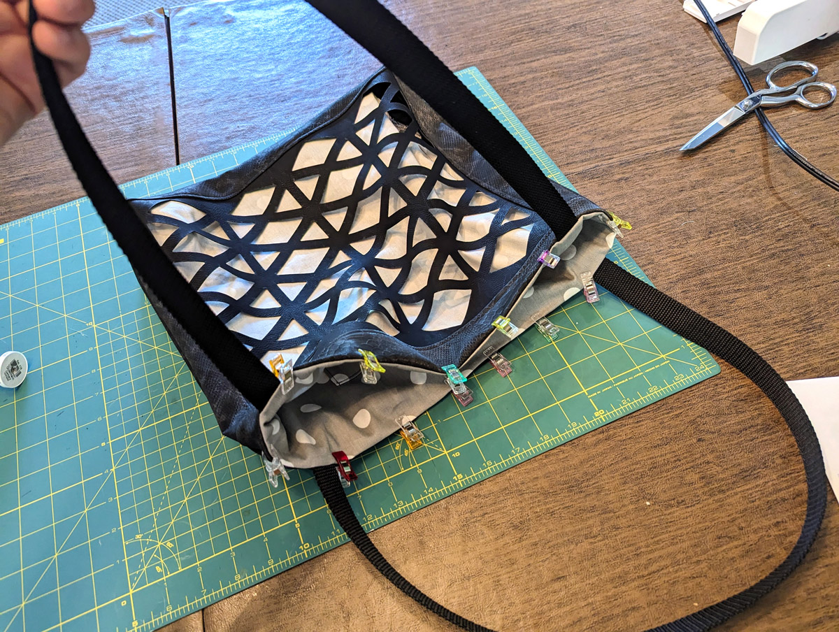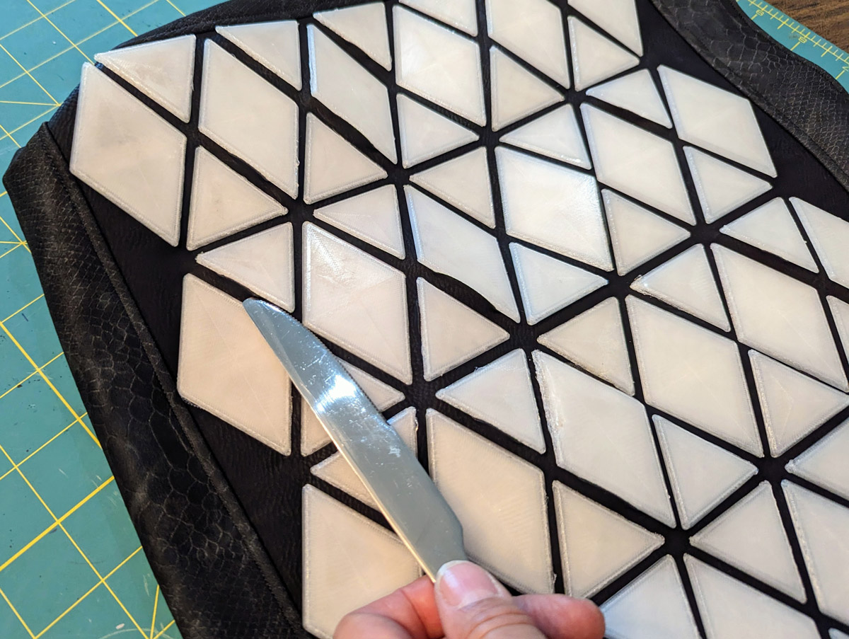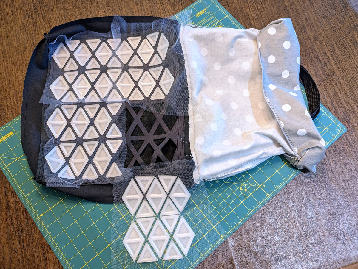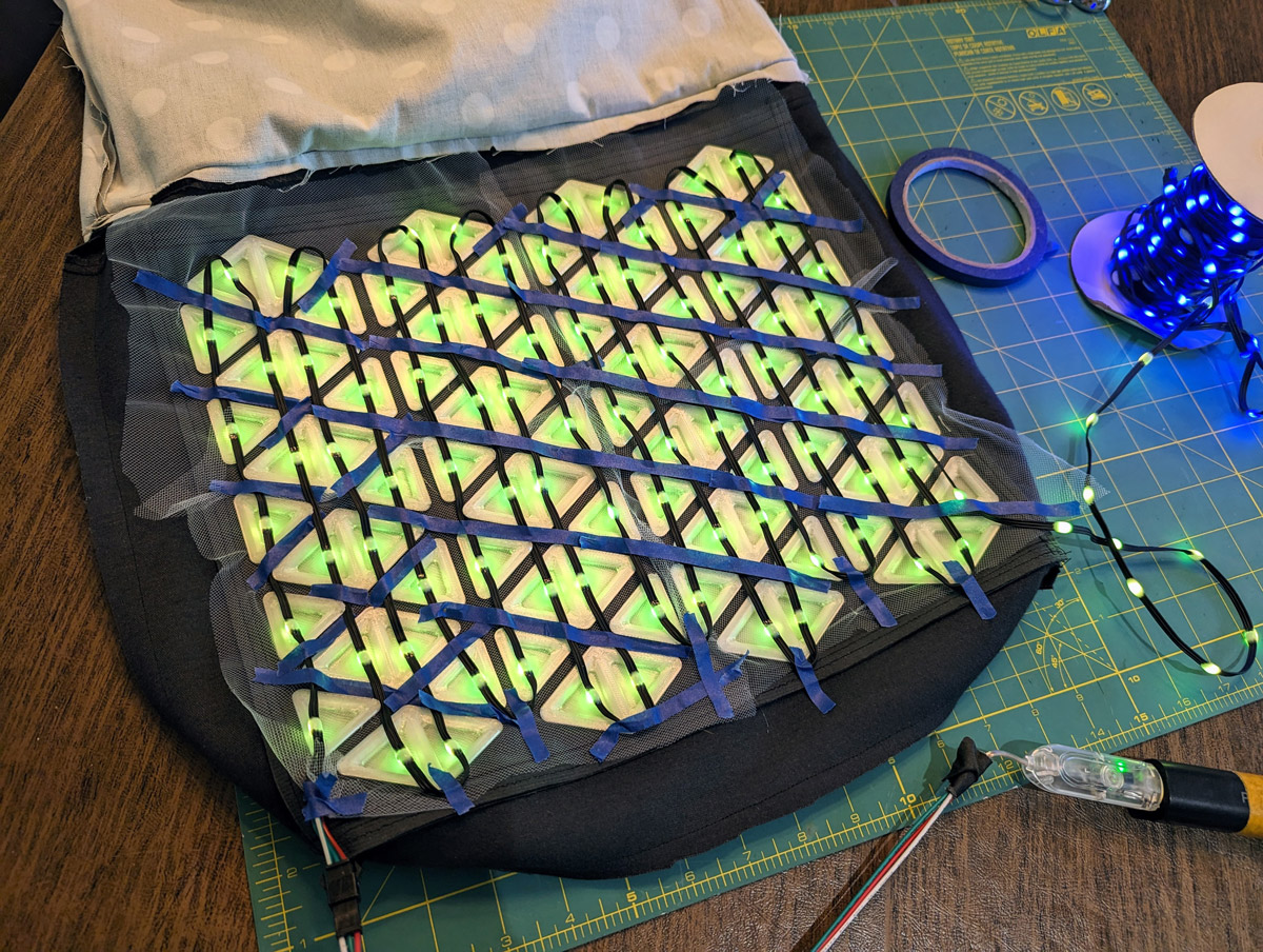 Since 2017, novel creative techniques, like 3D printing on fabric, and newly available products, such as uber-flexible LED strings, have continued to expand the potential of wearable tech. My new Tessellated Tote integrates a broad array of maker skills including 3D printing, sewing, and electronics to produce a modern carryall. The bag’s front panel is illuminated by lightweight addressable string lights secured behind translucent tiles which are 3D printed onto a layer of tulle fabric. The tulle holds the individual tiles in a space-filling geometric arrangement that moves and flexes with the fabric around it.