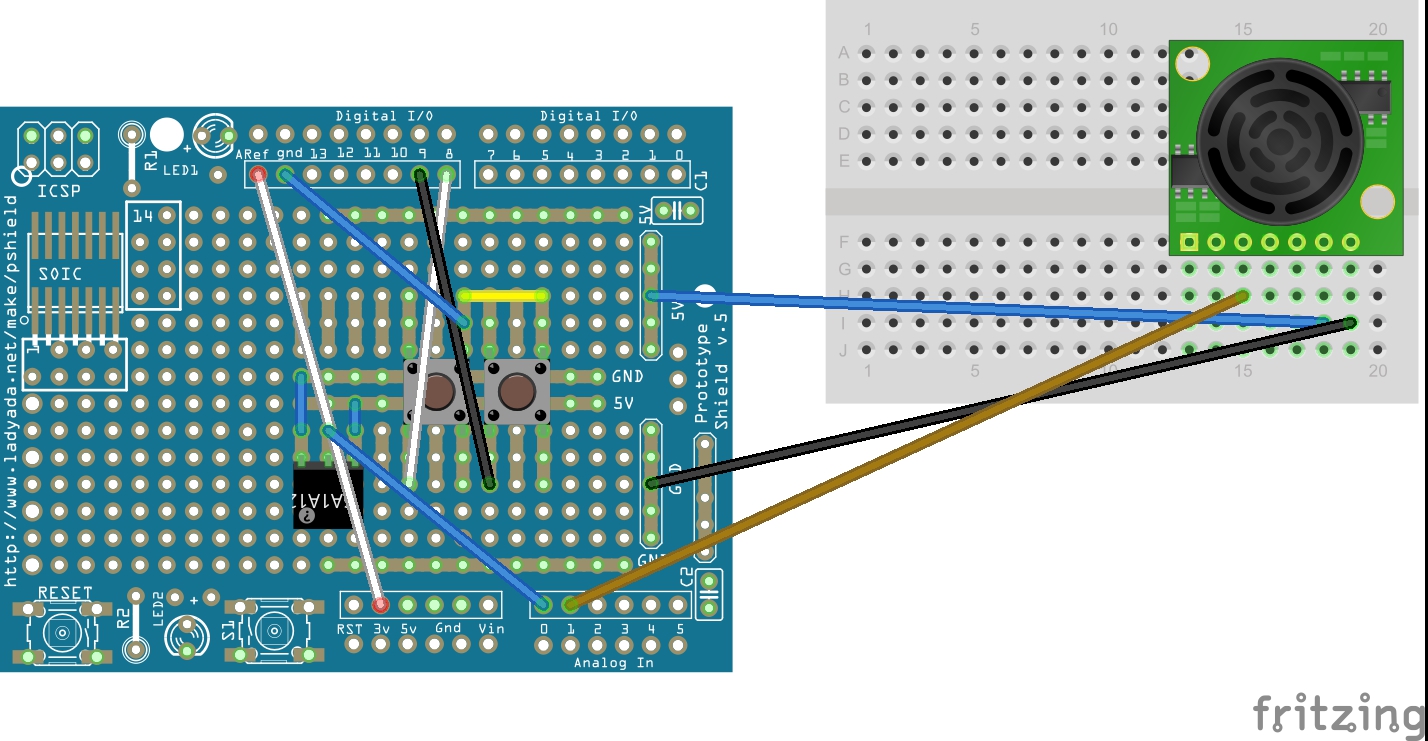 To achieve this effect, I added sonar using an ultrasonic rangefinder that can sense the distance of my hands from the sensor. I also gave my design the ability to play chords (polyphony) if you break two beams at once.