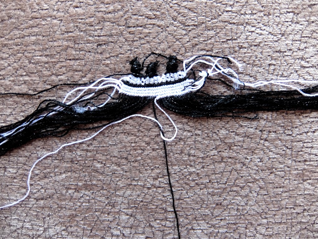 The structural thread is black. The working thread is white in the first square (Hydrogen); you’ll use different colors for different elements.