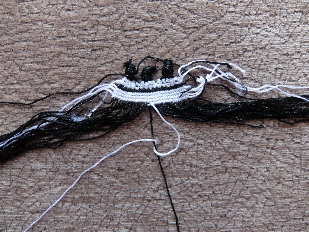 The black thread didn’t photograph well, so let’s take a better look at the two types of knots. In the picture below , the working thread (white) is knotting right to left; do it twice.