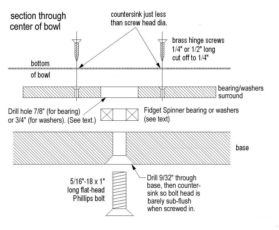 2. In the bottom of the base, countersink holes C, D, E, and F to fit flat-head #8×1½” wood screws. Countersink hole G so the 5/16″ bolt’s flat head will be barely sub-flush with the bottom of the base. Thread the bolt into that hole. Put the skate bearing or fidget spinner bearing over the end of the bolt. If you can’t find the specified bearing, use a stack of four 5/16″×¾”×1/16″ flat washers. The bolt must not protrude above the bearing (or washers). If it does, unscrew the bolt a bit, keeping its head sub-flush, and/or grind its end.