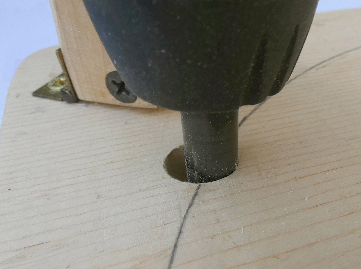 24. Hold the bowl-turning screwdriver roughly vertical, with its chuck sitting on the circle you drew around the bowl in Step 11. If the chuck is out of position, check your work — especially the hinge location — and for possible binding. Draw with pencil around the chuck’s tip and drill a 3/8″ hole. This hole’s locating dimensions in Figure C are approximate. The hole, for now, will be too small for the chuck to enter.