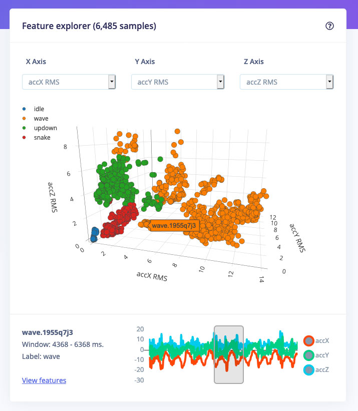 There’s also a lot of work to do to make ML more accessible to makers and developers, including creating tools and documentation. Edge Impulse is the exciting new tool in this space, an online development platform that allows makers to easily create their own ML models without needing to understand the complicated details of libraries such as TensorFlow or PyTorch. Edge Impulse lets you use pre-built datasets, train new models in the cloud, explore your data using some very shiny visualization tools, and collect data using your mobile phone.