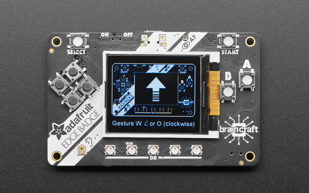 The two ML-ready boards I’ve had the most fun with are Adafruit’s EdgeBadge and the Arduino Nano 33 BLE Sense. The EdgeBadge is a credit card-sized badge that supports TensorFlow Lite. It has all the bells and whistles you could hope for: an onboard microphone, a color TFT display, an accelerometer, a light sensor, a buzzer and, of course, NeoPixel blinkenlights.