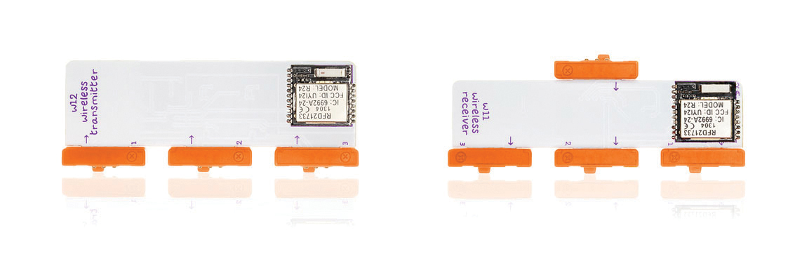 The wireless transmitter and receiver Bits work with each other in order to easily make your project work without need for the bits to be right next to each other. The transmitter communicates the incoming signals directly to the receiver, so it works without the need for a wireless network and without any kind of set up. These Bits are great because theyโre plug and play.