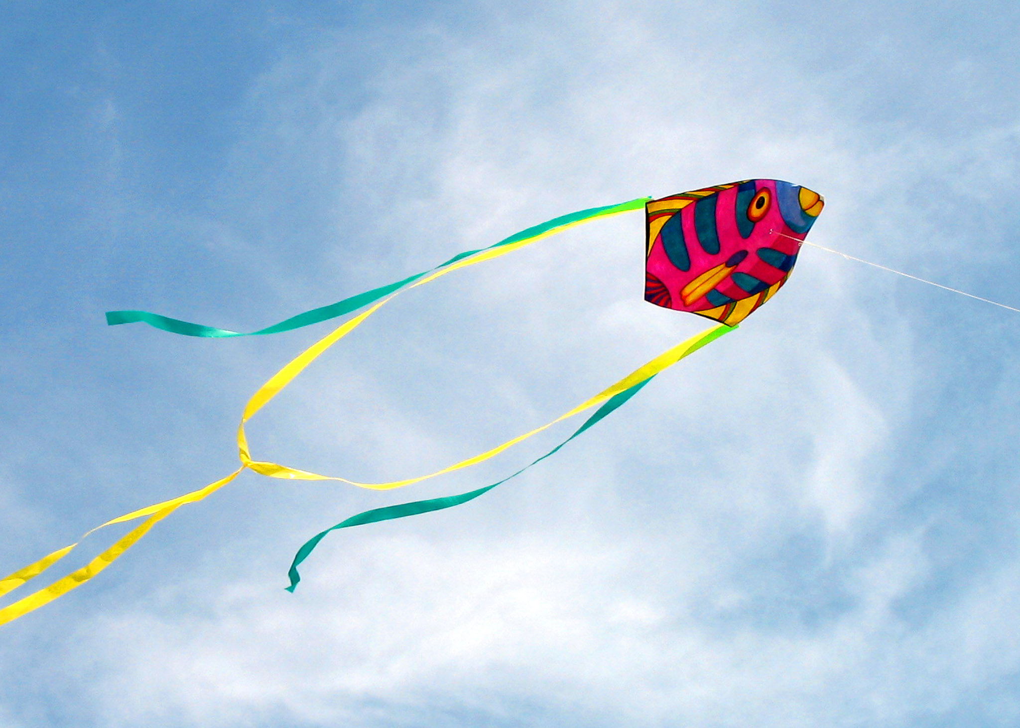 - Tail: Not all kites need a tail, but they can provide both stability and visual flair. Typically made from ribbons or strips of fabric, tails add movement and color to the kite’s flight. Since the Maker-Fish is a flat kite, it relies on a tail for stability and — bonus — the tail enhances its fish-like appearance, bringing the design to life in the sky.