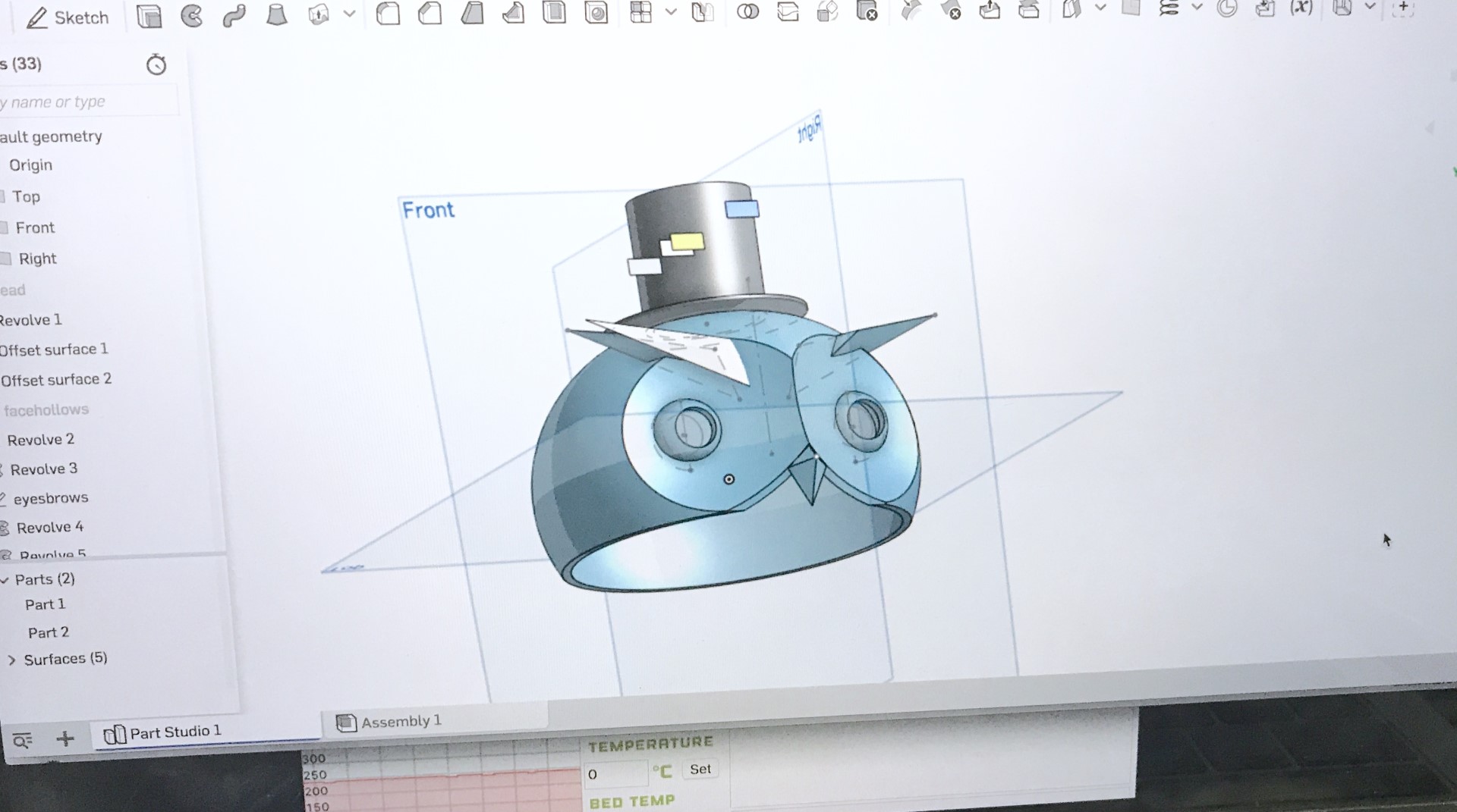 I used Onshape, a browser-based CAD modeling tool, to design Archimedes’ 3D-printed body parts. He comes in five pieces: the head, top hat, left and right wings, and front feather accent.