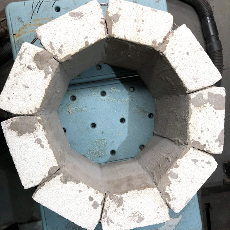 Using the same technique, I cut all nine bricks to give the long edges a 20° slant. I used a worn-out plywood blade (and scratched up the table) and the process worked — I could now build my nonagon forge with an inside diameter of 10″.