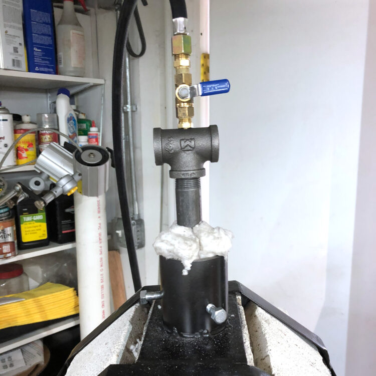After reading and viewing many articles and videos about making a burner, I decided that my tools and skills were not up to the precision modifications of the necessary brass and steel fittings. Fortunately, I found an affordable burner on Etsy. Once that arrived, I drilled the required hole through the forge and the steel plate using a 3″ hole saw, then mounted a short length of pipe, modified to hold the burner. I drilled and tapped three ⅜” holes spaced equally around the perimeter of this pipe, at a height where they’re best positioned for my burner. The pipe is welded to the steel plate to hold it in place; the burner is held in place with three ⅜” bolts.