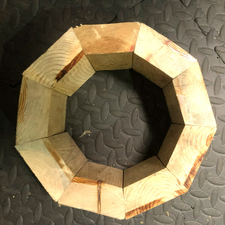 Firebricks are pricey, and therefore I decided to first model the cuts using some short 2×4s. I ran each 2×4 through the saw twice, once for each side. Then I arranged them in the proper shape, sawed-corner to sawed-corner and voilà, created a nonagon.