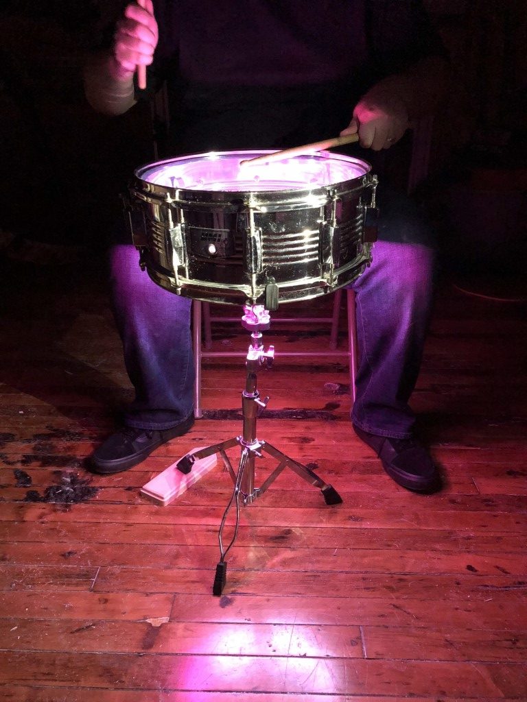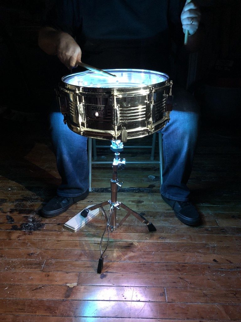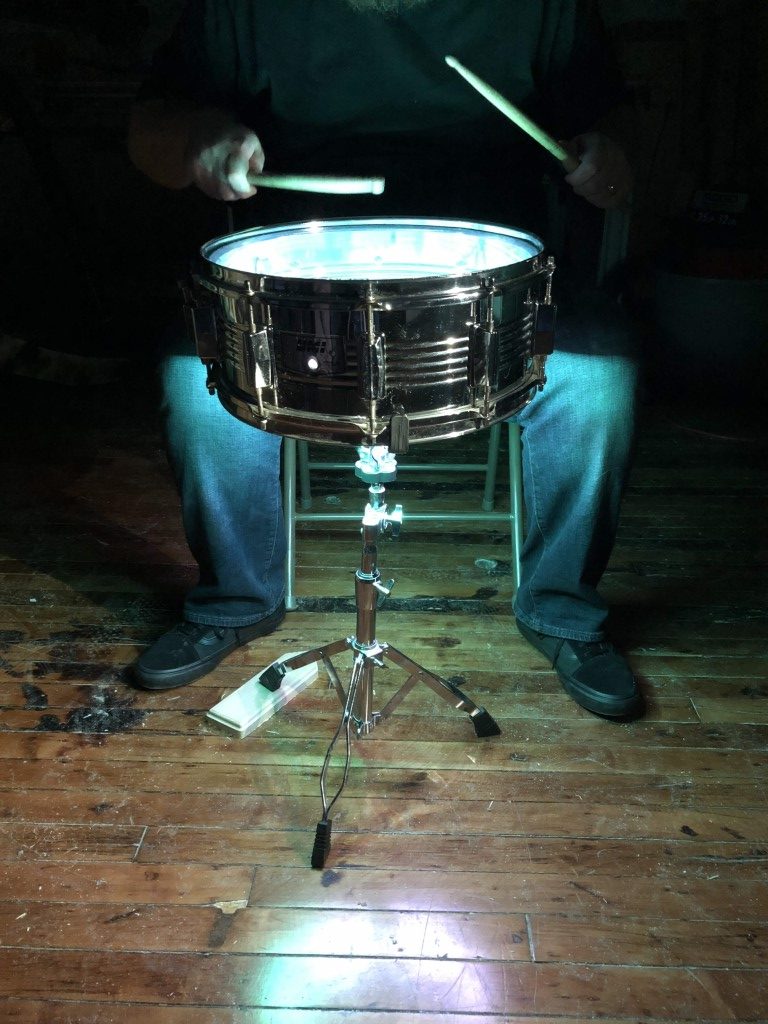 Now you’re ready to shock the world with your snare drum light show. I gave mine to Vinnie; he’s testing it out! Attach the parts inside your drum however you like. I think good quality velcro is the best bet but hey, it’s your instrument, make music and have fun with it.